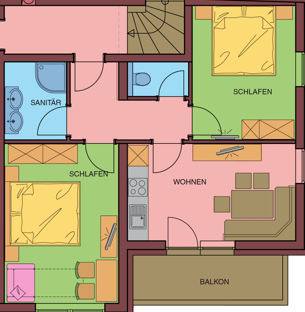 Die Ferienwohnung Sonnenblume verfügt über zwei getrennte Schlafzimmer sowie Küche und Balkon.