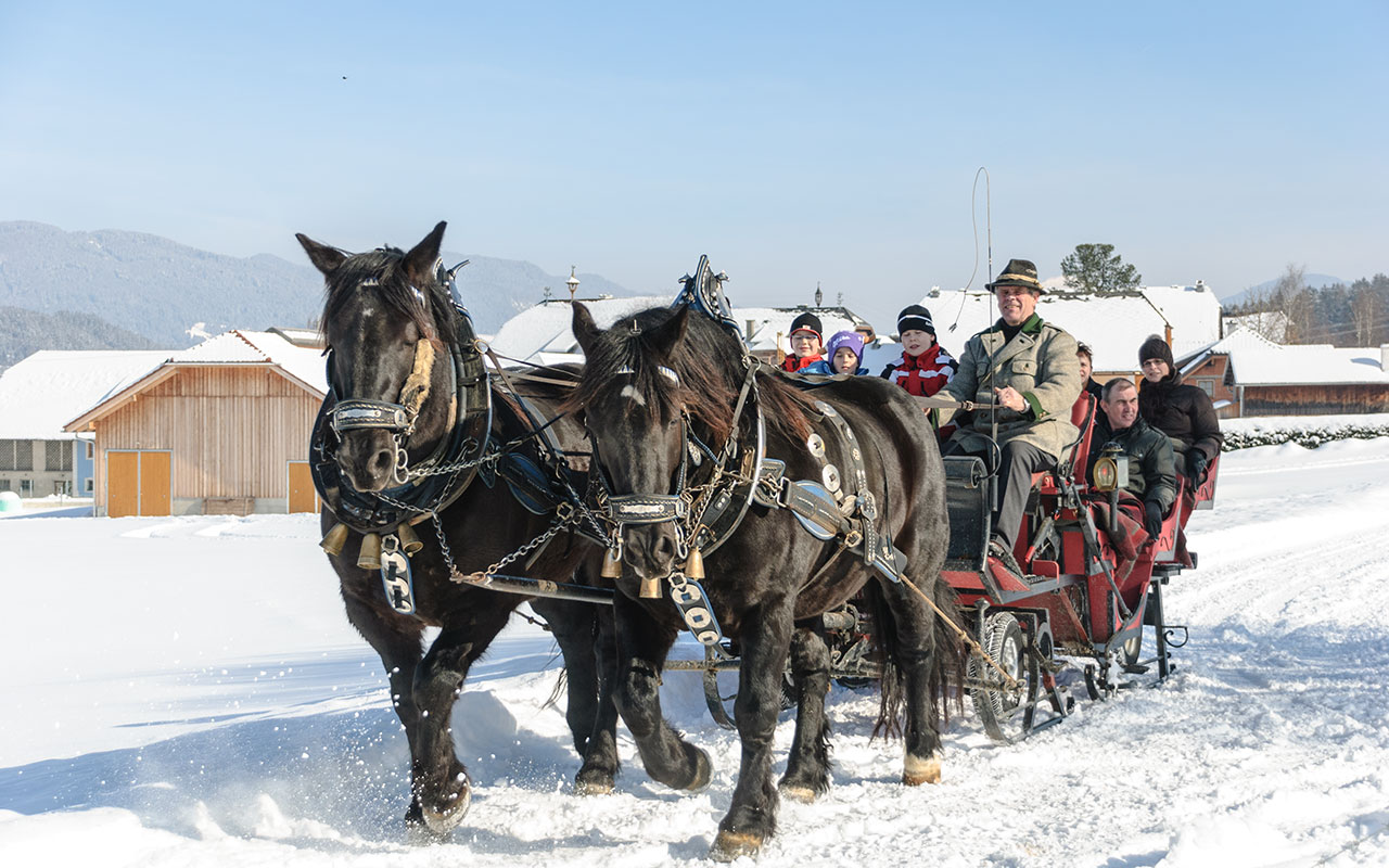 Eine Fahrt mit dem Pferdeschlitten gehört zweifellos zu den Höhepunkten eines Winterurlaubs und verleiht dem Aufenthalt eine ganz besondere Atmosphäre. Unsere majestätischen Noriker-Pferde ziehen den Schlitten durch die verschneite Landschaft, während Sie die Ruhe und Schönheit der Natur genießen können. Erleben Sie den Winterzauber des Lungaus auf romantische Weise bei einer Pferdeschlittenfahrt und schaffen Sie unvergessliche Erinnerungen.